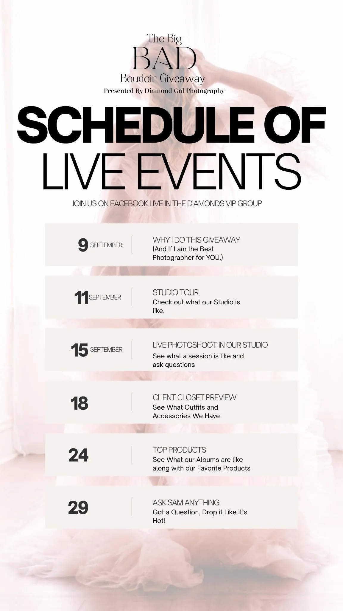 Contacting Our Team For Application Status Will Get You Disqualified. We do not cover travel fees for winners. Winning Session may not be transferred or gifted & has no cash value. Not Endorsed By Meta. Winning session must be held in 2025 from Monday-Friday or prize is forfeited. Failure to claim within 72 hours will forfeit your prize. You may not enter for someone other than yourself. Failure to attend your in person image reveal will forfeit your prize. All Sales are Final. Refunds are not offered for any purchases or upgrades you make at Diamond Gal Photography. Photographers or their employees may not enter. There are no free reschedules of photo sessions. Any rescheduled sessions will incur a $150 fee. You may not enter if you were ever rude to our team or didn't finish paying your payment plan. And Please Remember: Be Kind!